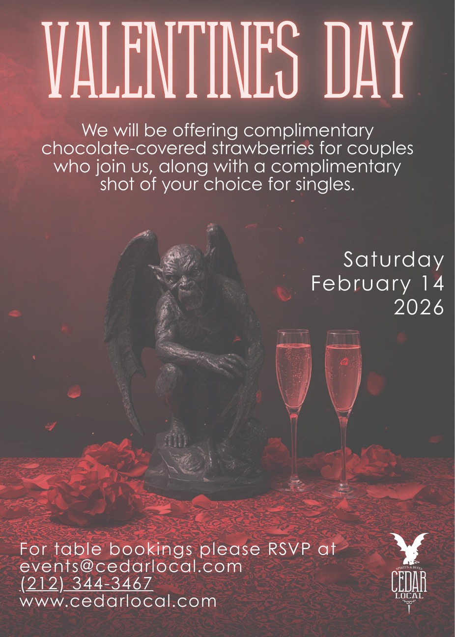 We will be offering complimentary chocolate-covered strawberries for couples who join us, along with a complimentary shot of your choice for singles.